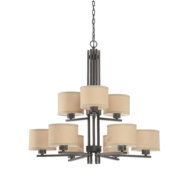 The two-tiered frame supports nine elegantly spaced lights, each topped with a soft ivory fabric shade that gently diffuses light to create an inviting, ambient glow. The rich bronze finish adds a touch of classic refinement, making this piece ideal for vintage, modern, rustic, or traditional interiors.